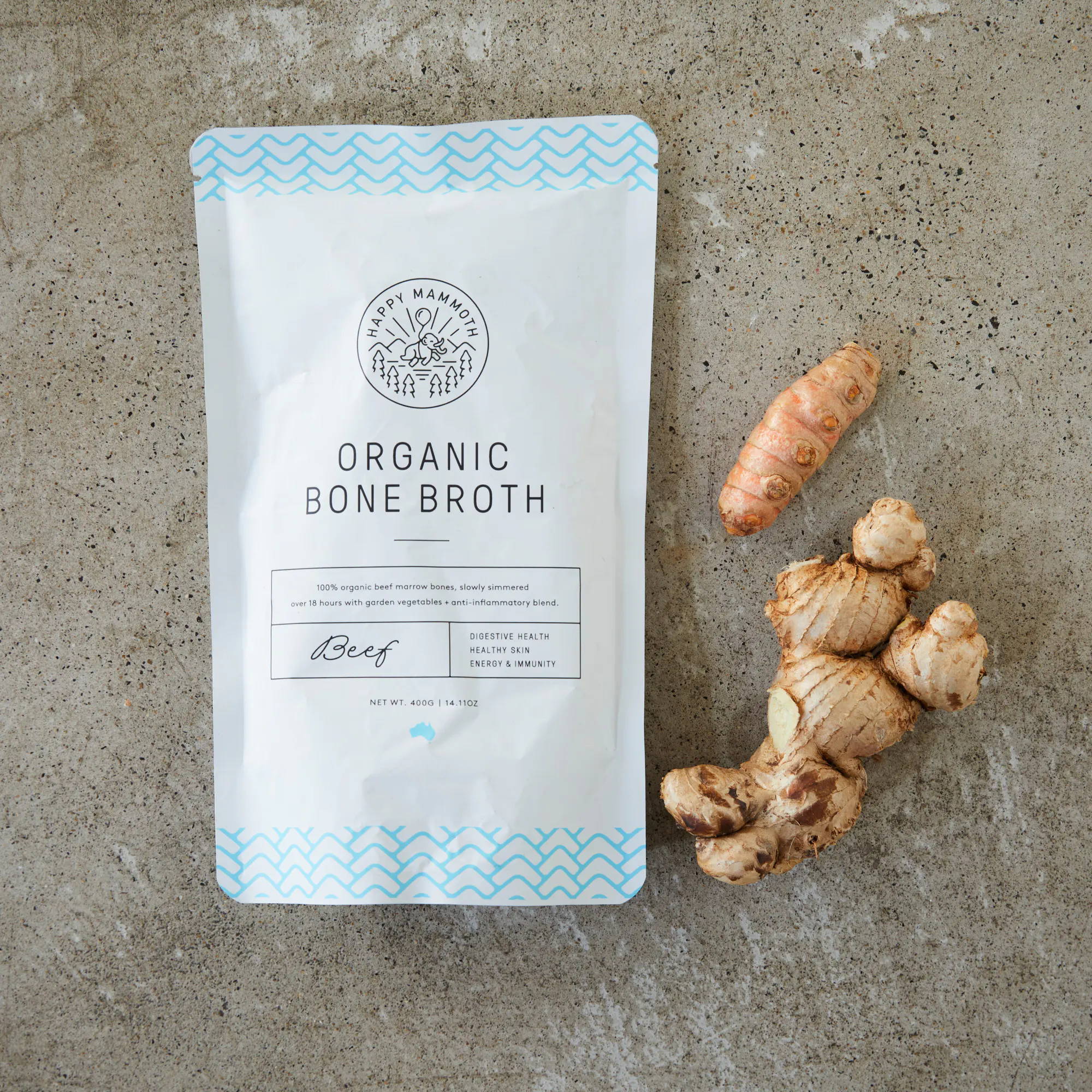 • Happy Mammoth organic bone broth is made from the marrow bones of 100% grass-fed, organically raised cattle from small Australian farms. We allow our premium bones to simmer for 18 hours with fresh organic vegetables and our anti-inflammatory blend consisting of turmeric, ginger, garlic and peppercorns.